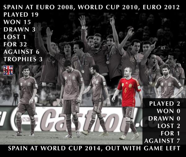 Whoever could have envisioned the end of Spain's era of dominance would not have imagined a dethroning so brutal or a surrender so tame as this. La furia roja have won their last three international tournaments, but the current champions are now the first team to exit the tournament as Chile produced a brilliant display to earn a well-deserved 2-0 victory.